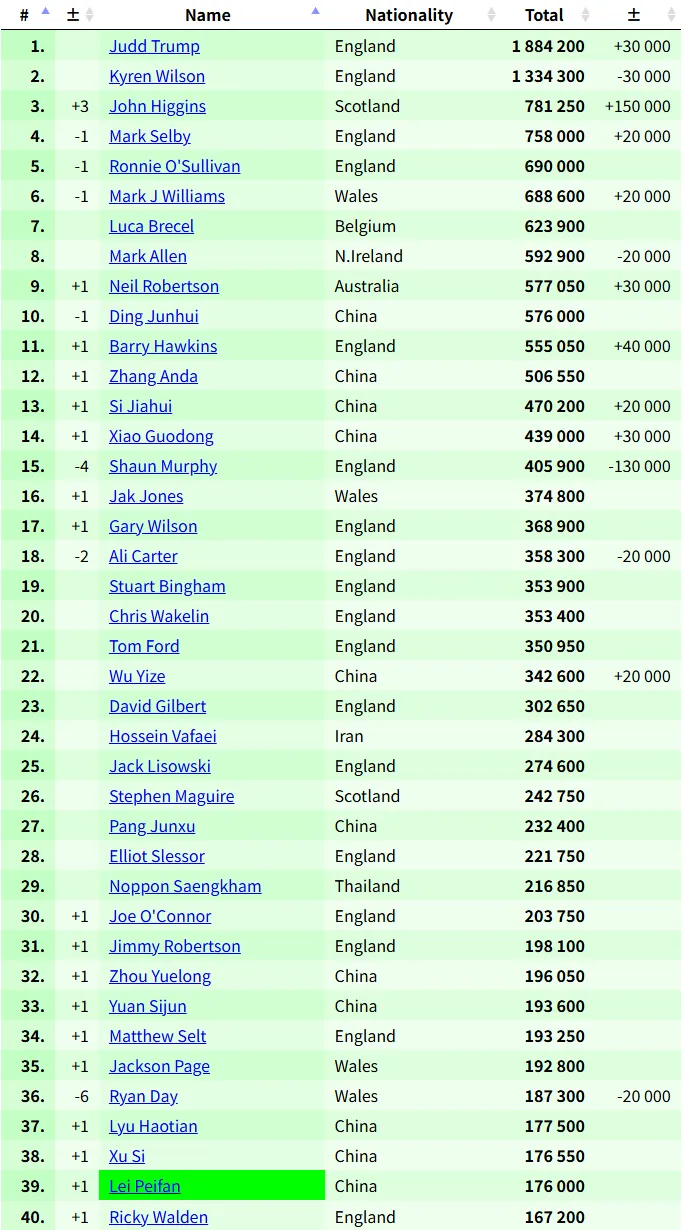 不算趙心童,現在斯諾克世界排名前40裏有11箇中國人