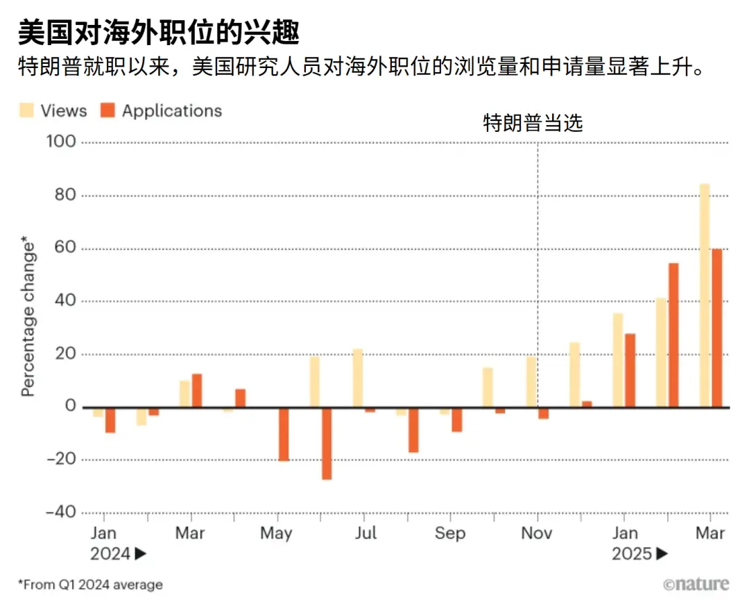 Nature Careers全球科學職位平台的數據顯示,2025 年 1 月至 3 月,美國科學家申請海外職位的數量比 2024 年同期增長了 32% ;與此同時,瀏覽海外職位的美國本土用户數量也增加了 35%。