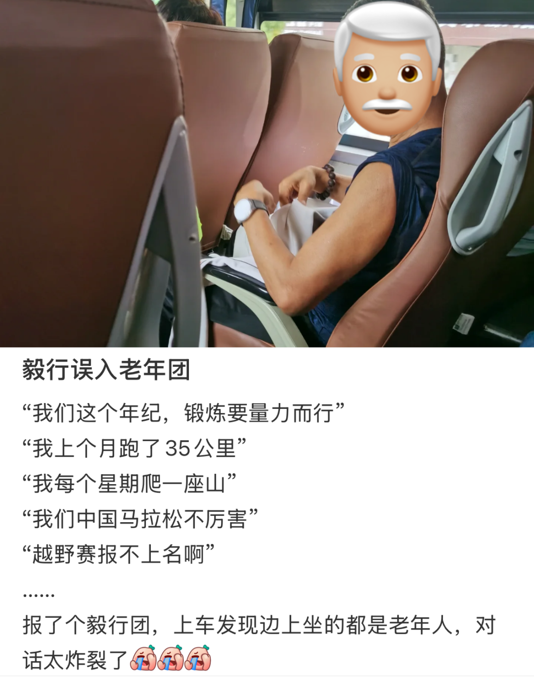 有人還發現,市面上層出不窮的老年團當中,很多已經開始規定60歲以上才能參加。“你以為他們是怕你體力超前,不好與老年隊員們統一管理,其實他們是怕小年輕跟不上自己。”