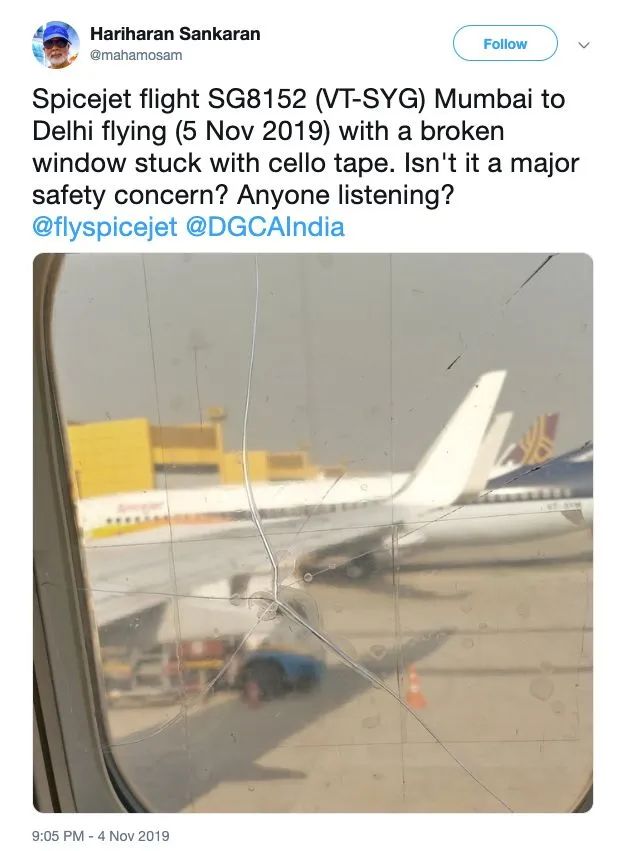 2019年,一名印度乘客在搭乘從孟買飛往德里的航班時,發現靠窗位置的窗户裂開了,上面貼上了透明膠帶,並無太大的問題,也是一樣的道理。
