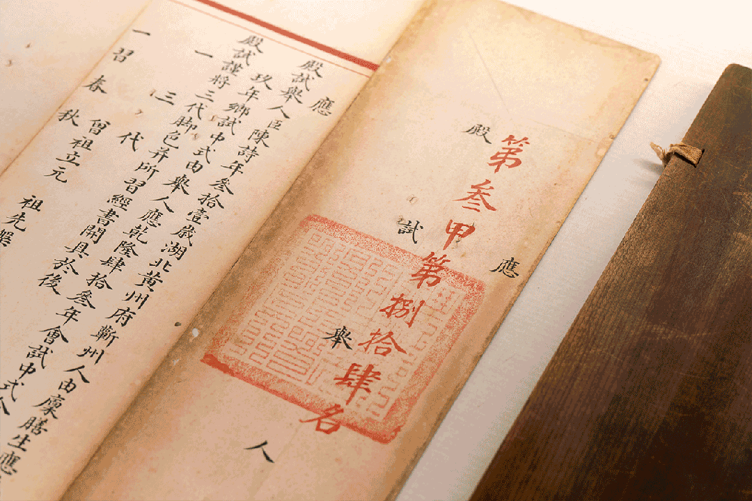 講“試”,有做得非常小、非常考究的夾帶的小抄,有金榜題名的捷報,還用了一份乾隆四十三年的考生殿試卷的真跡。這位名叫陳詩的考生考了三甲第84名,他的全文超過1300字,一字不錯,一氣呵成。旁邊有電子觸摸屏,觀者可以嘗試用毛筆臨摹,只要稍微寫幾個字,就會感到“身正筆正”之難。