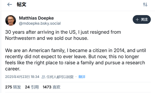 [1]https://www.chronicle.com/article/citing-trumps-targeting-of-international-students-a-professor-says-hes-leaving-the-country2.Matthias Doepke: “30 years after arriving in the US, I just resigned from Northwestern and we sold our house. We are an American family, I became a citizen in 2014, and until recently did not expect to ever leave. But now, this no longer feels like the right place to raise a family and pursue a research career.” — Bluesky3. economics.northwestern.edu4.https://www.lse.ac.uk/economics/Assets/Documents/FacultyCVs/Doepke-updated-CV-2024.pdf5. https://mdoepke.github.io/index.html6. https://www.lse.ac.uk/economics/people/faculty/matthias-doepke7.https://news.cctv.com/2025/04/19/ARTIQYaMpwfNaemSCrQkG8VN250419.shtml8. https://www.axios.com/2025/03/06/state-department-ai-revoke-foreign-student-visas-hamas