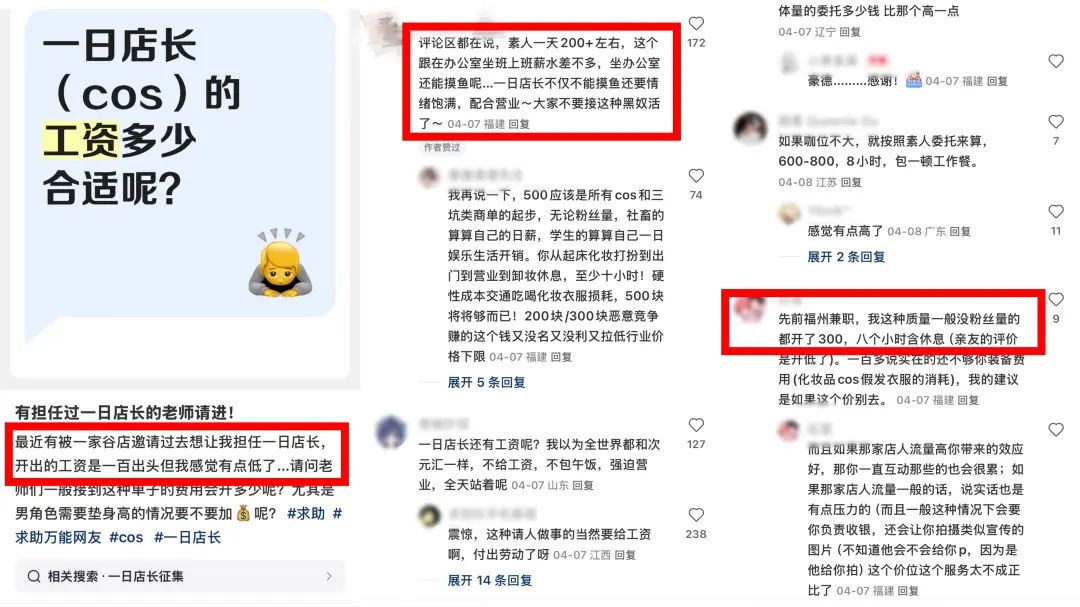 另一方面,即便是帶貨能力最獲業內認可的COS圈,普通COSER去當“一日店長”的報酬也一降再降。在小紅書平台上,不少COSER吐槽一日店長的日薪已經被捲到200多元一天,這代表着,扣掉出行成本、COS裝備如假髮服裝消耗等和化妝成本,基本上是“為愛發電”,不僅賺不到錢還要提供長時間的情緒價值。