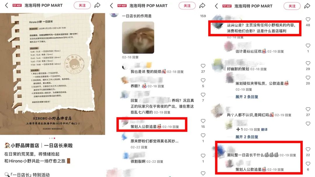 這意味着,當品牌一味地複製“一日店長”模式,而忽略了品牌的自身調性的時候,不僅無法吸引新的客羣達到破圈,甚至還會傷害忠實粉絲的感情。特別是像泡泡瑪特這類以IP為核心的品牌,粉絲們自然會對品牌活動的“純度”要求更苛刻——他們不能容忍任何“不夠懂IP”的人來吃這份IP紅利。