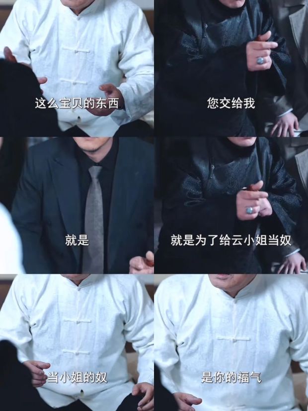 故事開頭,身份尊貴的老頭從病牀上滾下對她喊小姐,還要把“小姐的奴”的身份傳給後代。故事中間,老頭的孫子當奴逐漸如魚得水。故事最後,隨着女主身世揭開冰山一角,設定中的八大家跪了一地“恭迎小姐歸來”,後代隨她驅策。