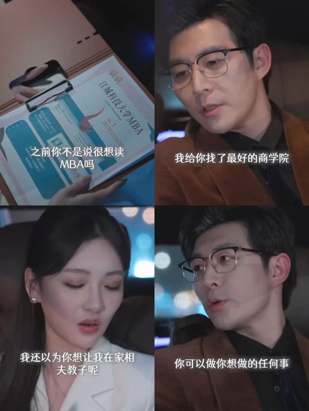 如果女主的設定是牙尖嘴利不內耗,男主往往不會過多插手,臉讓她親手打、仇讓她親手報。又如,男主願意分享資源,成為女主成長與事業的輔助,“支持她做她想做的事”一類台詞在不同霸總口中頻頻出鏡。