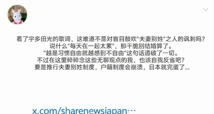 宇多田光因新歌提到夫婦不同姓引發日網抨擊,中網友:日本人就那麼喜歡合成大佐藤嗎?_風聞
