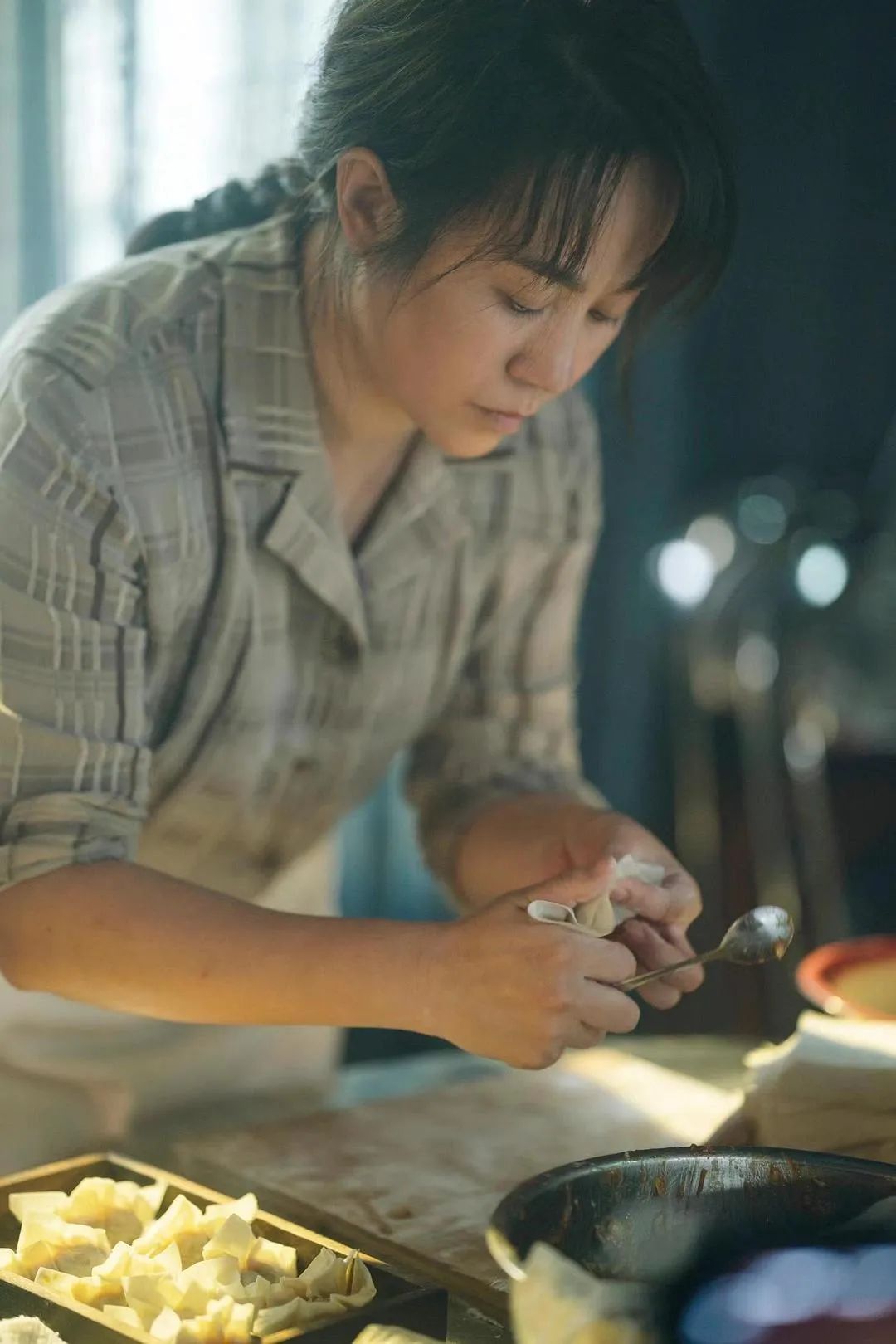 最典型的一場戲,是臧姑娘改良水餃失敗後,獨坐在凌晨的廚房。她沒有崩潰,沒有台詞,甚至沒有情緒化的肢體動作,只是反覆地揉麪,眼神釘在那團不成型的麪糰上,汗水打濕了衣背,麪粉糊滿了臉。這場戲幾乎沒有剪切,卻讓人屏住呼吸。