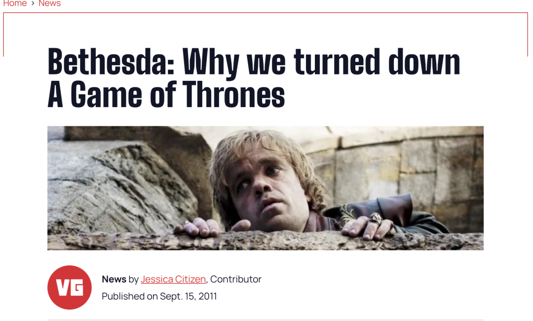 早在2006年,文學創作之餘酷愛遊戲的喬治·馬丁,就曾經聯繫過B社,表示願意將《冰與火之歌》免費授權給對方,進行遊戲化創作。但對方以正在忙於“老滾5”為由,進行了婉拒。