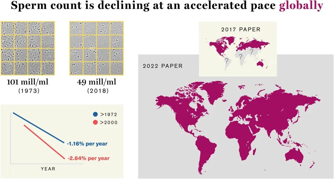 2022年該項目的數據進一步更新,範圍擴展到了全球,但結果顯示成年男性精子濃度和數量仍在持續下降,幾乎達到腰斬的程度,頗有積重難返之勢。
