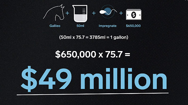 1加侖(約3785毫升)伽利略種馬精液的估值達到了驚人的4900萬美元,拳打蠍子毒液(3900萬美元/加侖),腳踢眼鏡王蛇毒液(15萬美元/加侖),臨了還得踩上真丶非法毒品LSD(12.3萬美元/加侖)一腳,誰看了都得説聲“液體黃金”。