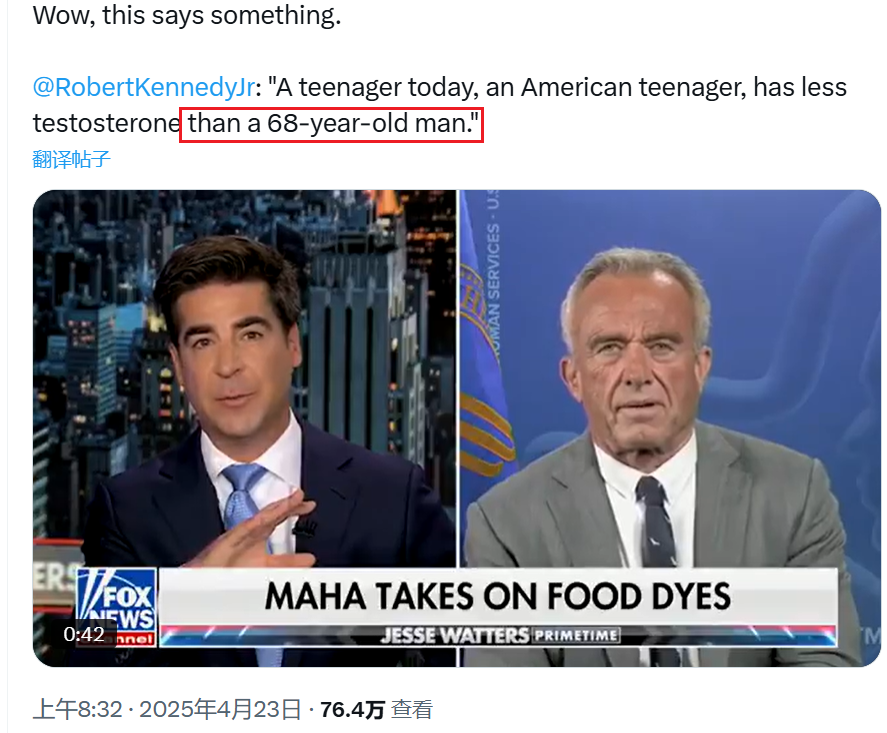 “我們的生育率正急劇下降,青少年的的睾酮水平和68歲的男性一樣。我們孩子吃的根本不是真正的食物,這些合成色素讓如今美國男孩的精子數量下降了50%,女孩的青春期提前了六年。”