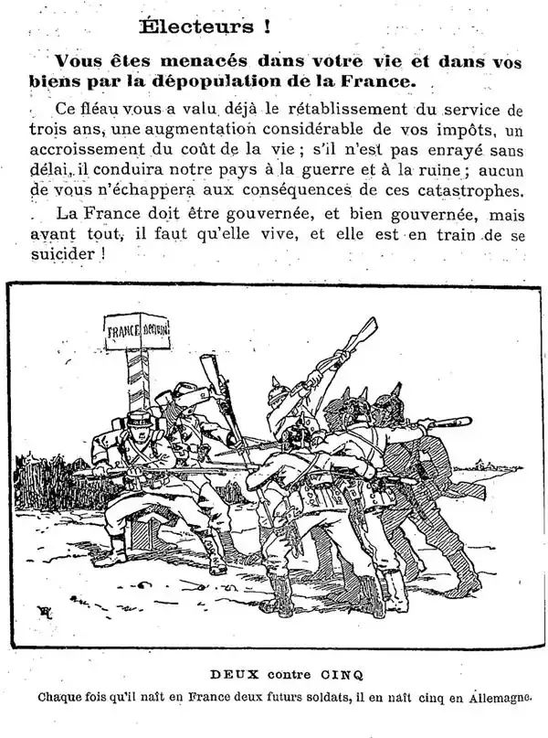 在民間,由法國著名統計和人口學家貝提庸(Jacques Bertillon,1851-1922)成立的“人口聯盟”在國內散發了150餘萬份宣傳傳單,在生育率上和鄰居德國較勁。