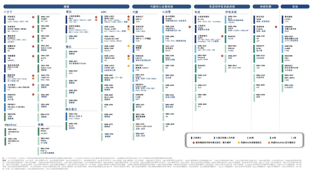 公司擁有廣泛的藥物組合,戰略性地覆蓋多個具有重大未滿足的醫療需求和增長潛力的治療領域。截至最後實際可行日期,公司擁有110多款商業化藥物,包括19款新分子實體創新藥和四款其他創新藥。此外,截至同日,公司的管線涵蓋逾90款候選新分子實體創新藥及七款處於臨牀及更後期階段的其他創新在研藥物,包括30多款處於關鍵性臨牀研究或更後期階段的創新在研藥物。