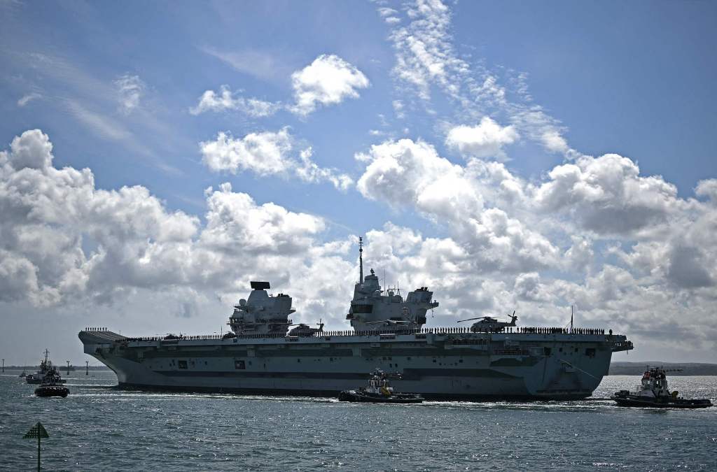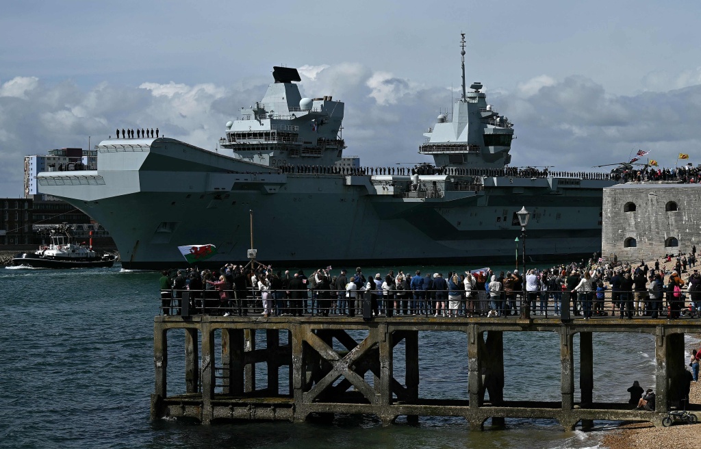 當地時間2025年4月22日,英國南海岸朴茨茅斯海軍基地,英國皇家海軍航母威爾士親王號在拖船的護航下啓程,前往印太地區。視覺中國 圖