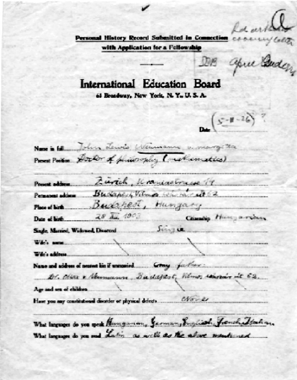 圖2 馮∙諾伊曼1926年申請去哥廷恩進修數學的表格