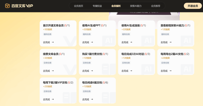 此外,百度文庫上線了完整的會員福利系統,在過去的文庫會員基礎上鼓勵會員使用AI生成PPT、漫畫、對話等不同能力,並提供對應的抽獎激勵。但有用户表示,百度文庫的AI搜索結果有時與搜索目標無關,且思考時間長,錯誤也多。而其AI功能對使用次數有嚴格限制,體驗中斷的感覺也令用户不滿。