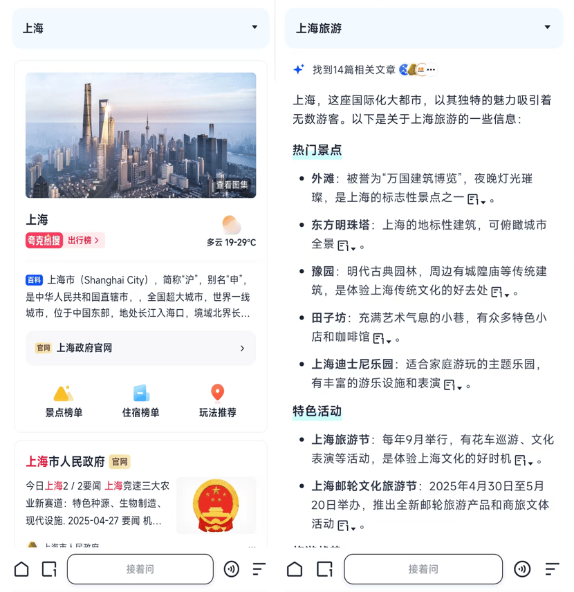 「市象」體驗發現,在最新版本APP端夸克搜索中,當用户搜索專有名詞(如上海),夸克會直接展現網頁搜索結果,而當用户搜索詞組(如上海旅遊),即便並未開啓“深度思考”功能,夸克仍會進入數秒鐘的AI思考過程,並優先展現完整AI生成結果,WEB端也同樣如此。