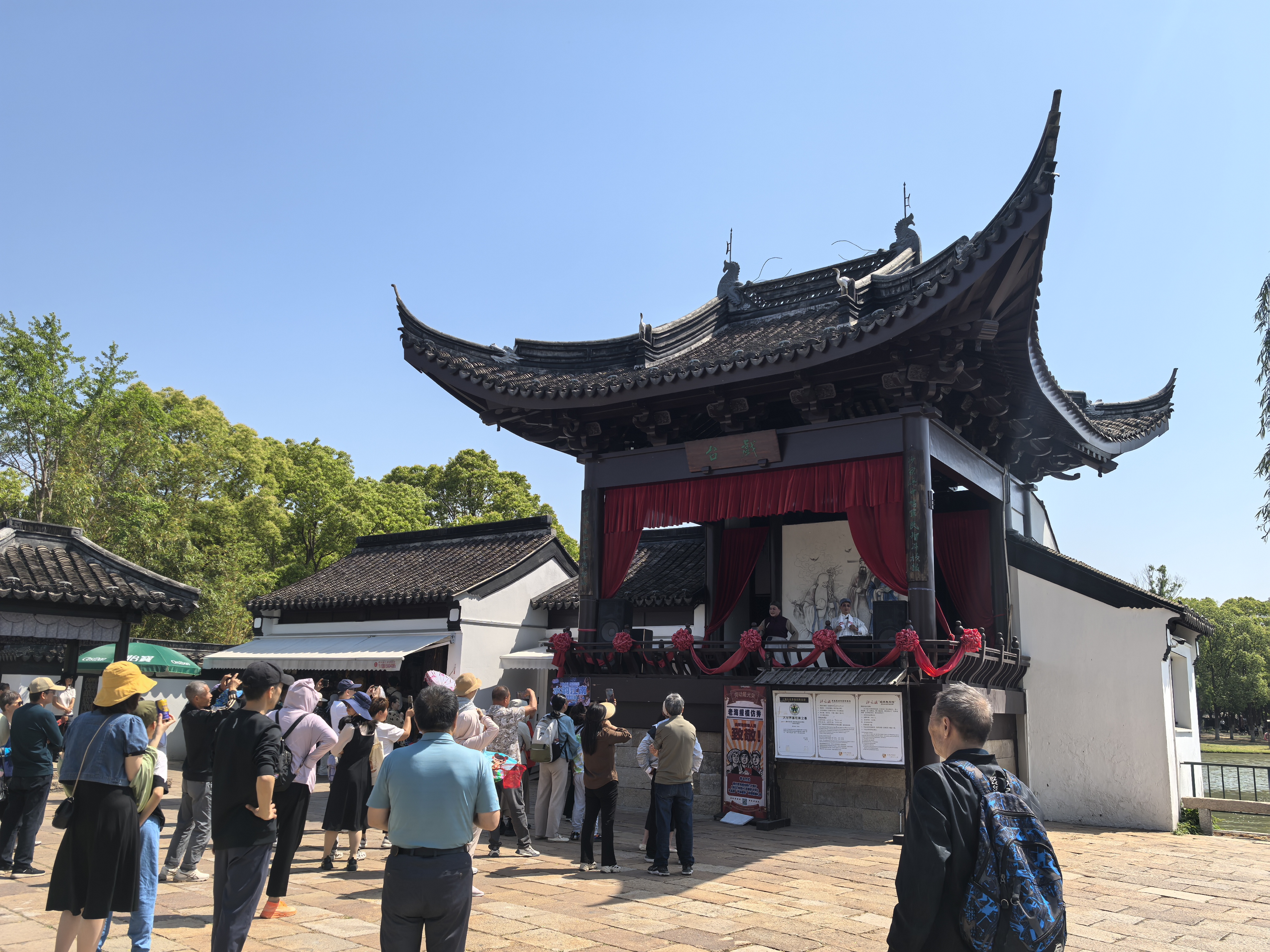 景區內部有仿古建築,戲台還有不可或缺的茶館。坐在河邊的茶館裏,點一杯茶,看一齣戲,吹一吹和風,讓人感到愜意至極。園區中間有一個大型舞台,表演的節目就叫“蘆蕩火種”。上午和下午各有兩場,節目運用了仿真的煙火來模擬槍炮聲,據説觀感體驗極佳。但可惜我們蹬三輪慢了一些,等我們趕過去時已經散場了。烏泱泱一大羣人湧了出來,中央小島瞬間擁擠不堪。路邊上買水果飲料的,排隊等班車的,叫賣聲,吆喝聲,找大人尋小孩真的是熱鬧非凡。結果我們又給哼次哼次的再迅速蹬出去,可把孩子們累的夠嗆。
