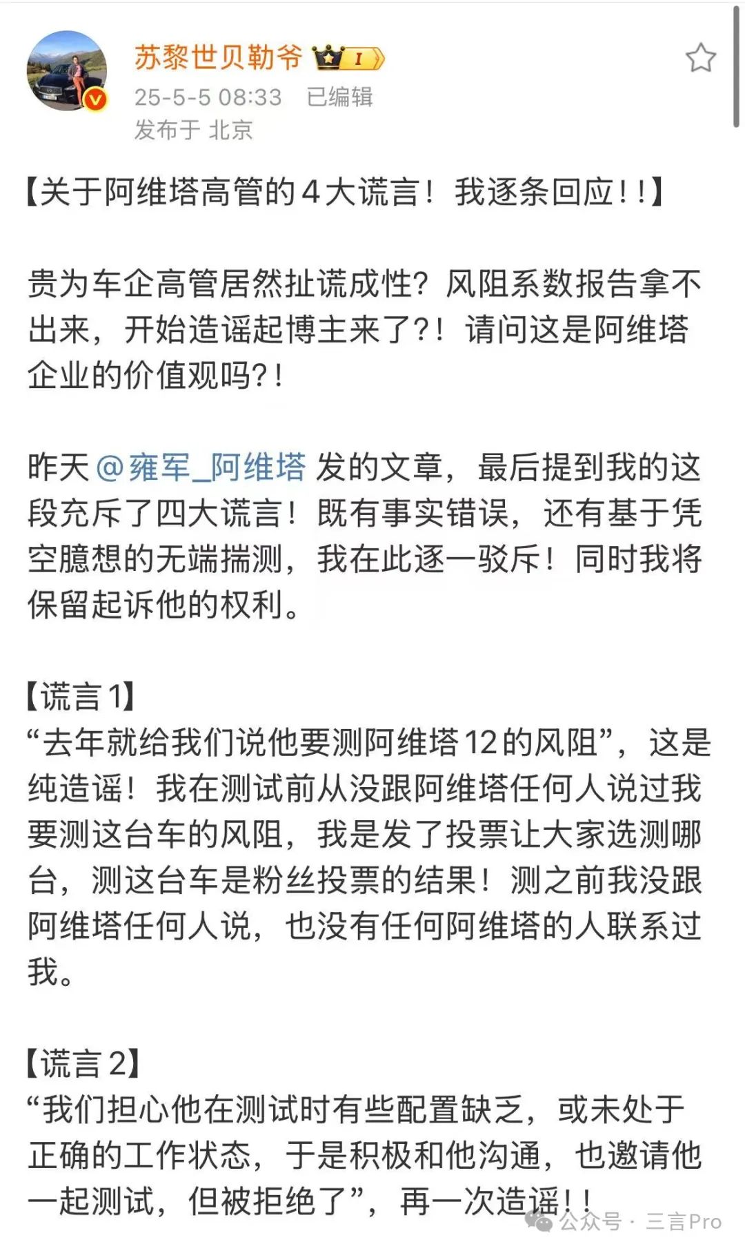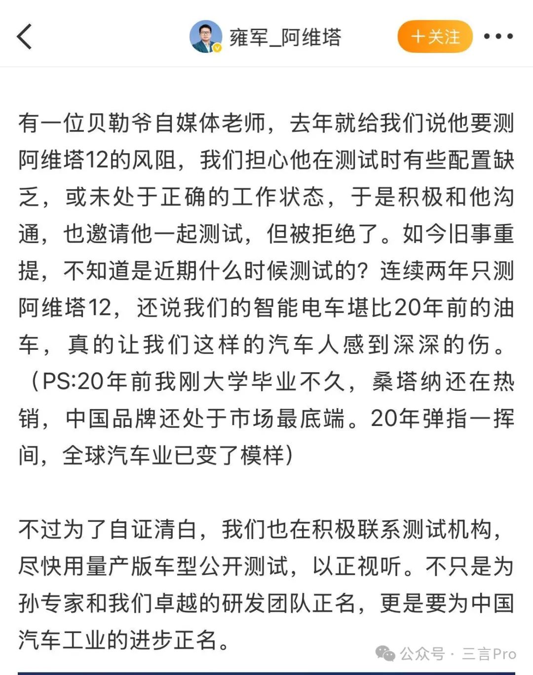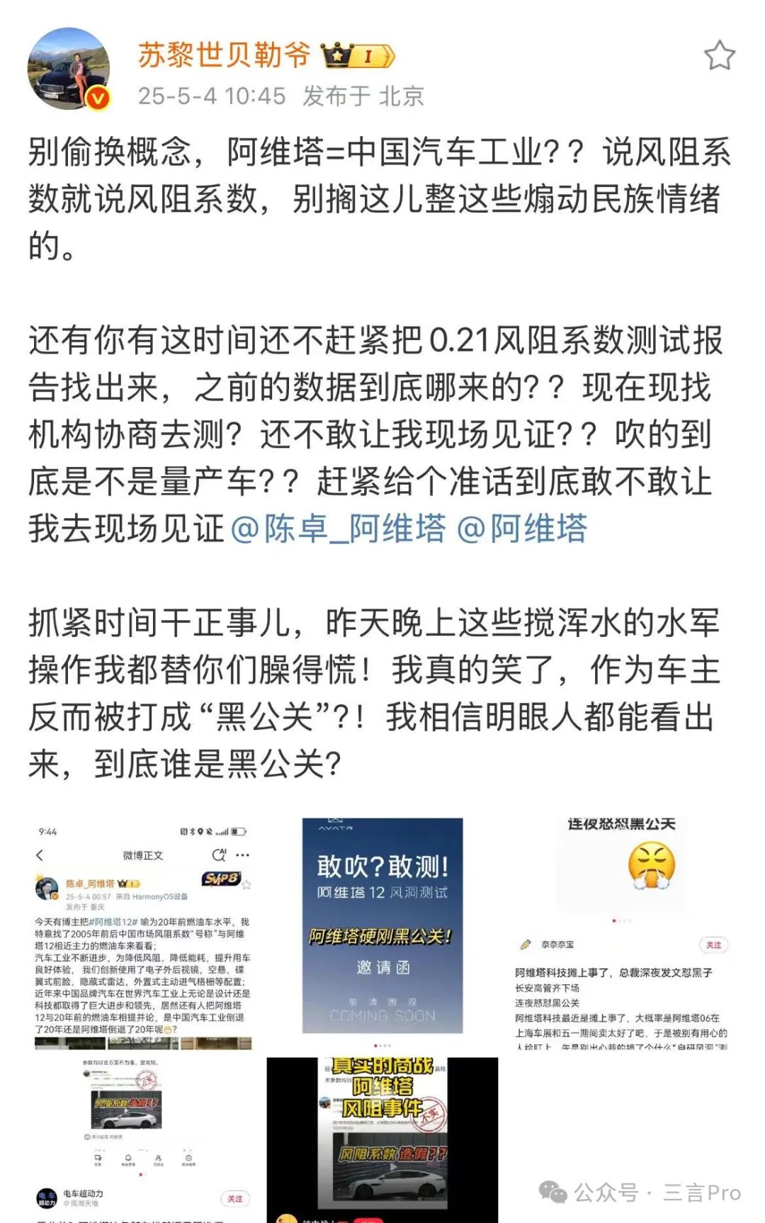 5月5日,博主“蘇黎世貝勒爺”針對阿維塔科技副總裁雍軍的發文給出回應,稱“去年就給我們説他要測阿維塔12的風阻”的説辭並非事實,選擇測試哪台車是粉絲投票而來,測試之前也從未與阿維塔人員有過聯繫,還表示“這是你們的公關部門在我當天剛測試完,看到我微博上發了在風洞測試的準備畫面,過來跟我説關於測試你們覺得我們不專業,我明確表示了你們的擔心都是最基本的風洞測試常識,我們全部都有正確操作”。