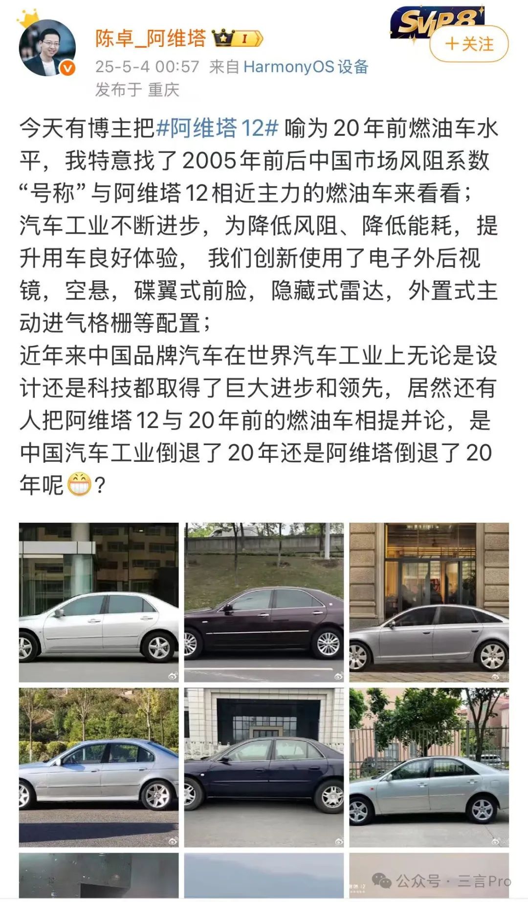 5月4日凌晨,阿維塔總裁陳卓發微博表示,近年來中國品牌汽車在世界汽車工業上無論是設計還是科技都取得了巨大進步和領先,居然還有人把阿維塔12與20年前的燃油車相提並論,是中國汽車工業倒退了20年還是阿維塔倒退了20年。