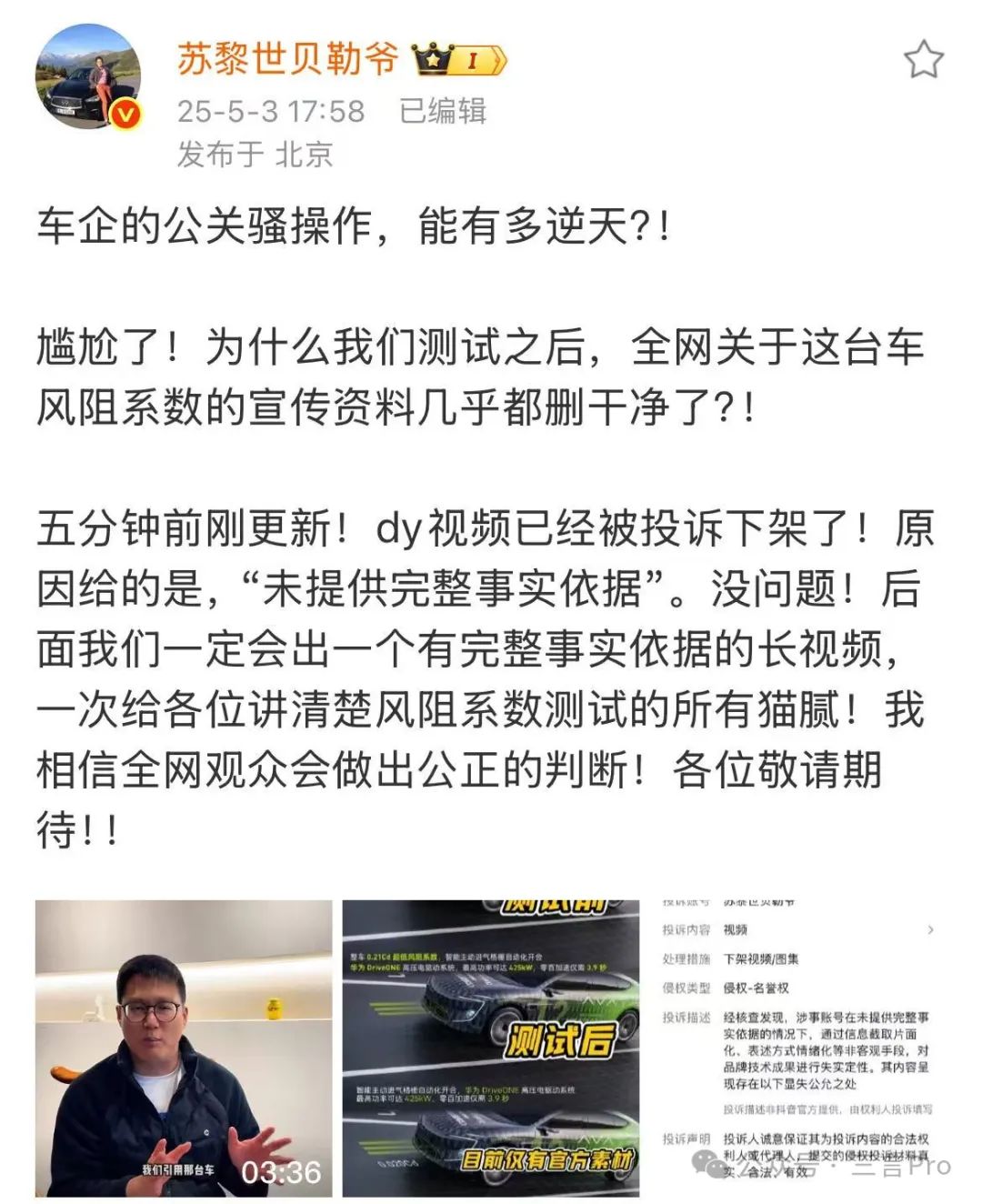 針對於阿維塔官方所表示的近期將公開進行測試,博主對此回應稱自己可以提供一台量產版的阿維塔12配合官方進行測試。同時此前博主發微博稱,自己發佈的測試視頻在發佈後不久就疑似被品牌方投訴下架了,阿維塔刪除了“0.21Cd”宣傳表述。