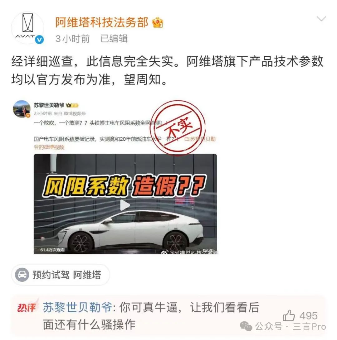 當天晚些時候,阿維塔官方微博發文稱,宣佈將根據國家專業機構實驗室排期,對阿維塔12進行公開風洞測試,以“權威數據正視聽”。