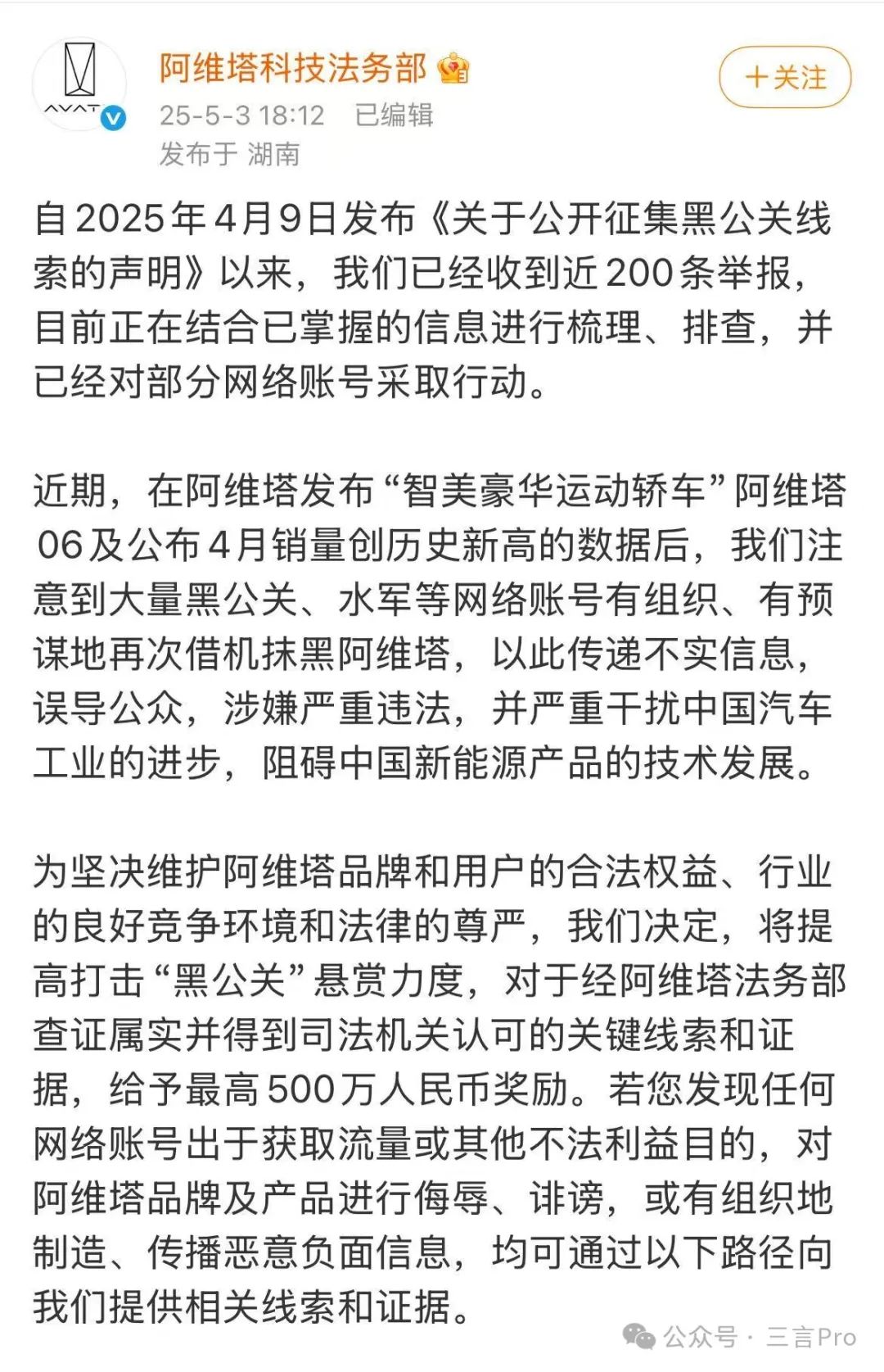 同一時間,阿維塔科技法務部官方微博又發文稱,法務部懸賞500萬元徵集線索,稱已處理部分賬號,並指控近期存在有組織抹黑行為。