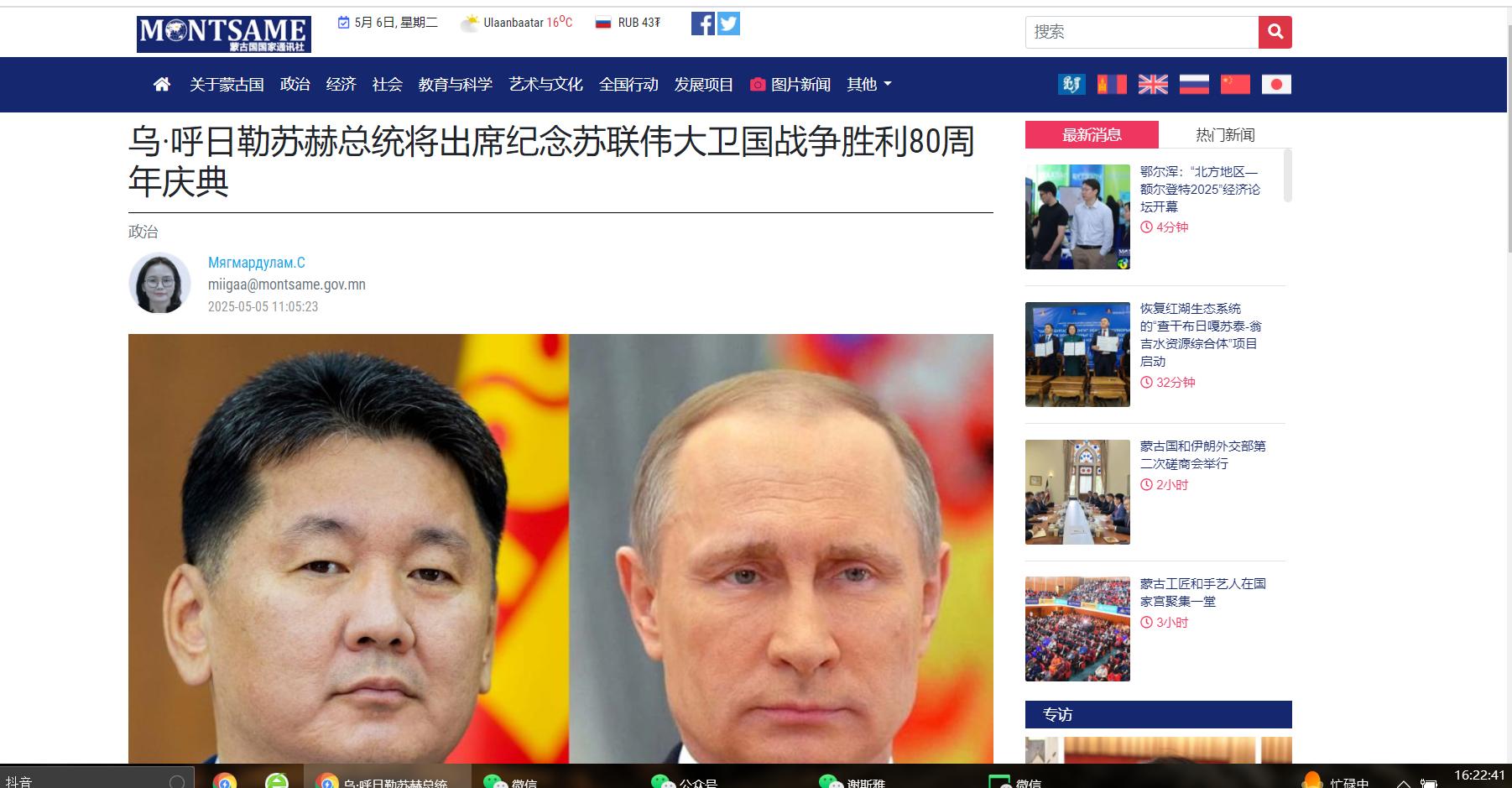 看了一下人家自己的報道,烏·呼日勒蘇赫總統將於5月9日與其他國家元首和高級官員共同出席在紅場舉行的紀念蘇聯偉大衞國戰爭勝利80週年慶典,並將向位於亞歷山大花園的無名烈士墓敬獻花圈。