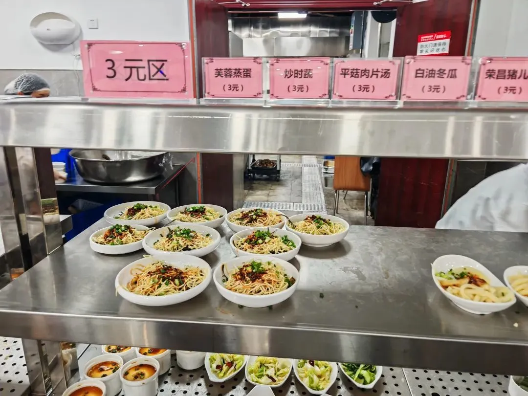 工業風的食堂很整潔,打菜員工穿着統一的白色制服,戴着頭套、藍色口罩和一次性塑料手套。打菜窗口前的紅色標籤標註着菜名和價格,比如豬油泡粑、榮昌涼麪、榮昌豬兒粑、白油冬瓜、平菇肉片湯都是3元,魚香肉絲8元,紅燒排骨和紅燒豬蹄10元,像極了老字號的小吃名店。陳小媛最喜歡的是涼麪,勁道的麪條上面淋着紅油,味道甜香可口,而且不算太辣,“真的是驚豔到我了”。她還喝到了2塊錢的銀耳羹,“特別好喝”。