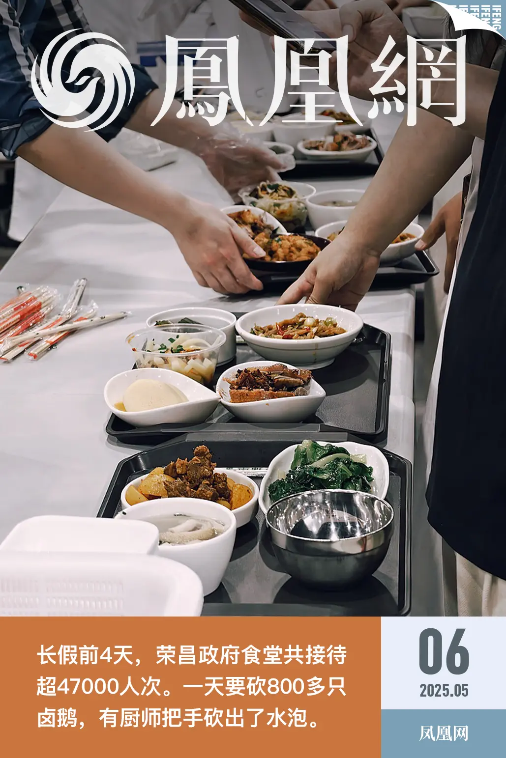 而據媒體報道,五一的前4天,榮昌區政府食堂一共接待了超過47000人次。其中僅5月1日一天,食堂就消耗了1500斤豬肉,蒸了280盆米飯,廚師“手都炒麻了”。因為一天要砍800多隻滷鵝,有的廚師手也砍起泡了。為了保證人手充足,食堂還從其他地方調來了50多名工作人員幫忙。