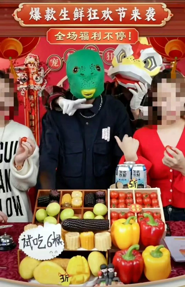李響了解到,今年2月,在三隻羊旗下的抖音直播間裏,出現了兩位分別戴着綠色鯉魚、紅色獅子頭套的神秘人物,二人全程未發一言,只偶爾對着鏡頭比手勢。當時,網友通過身形輪廓、佩戴項鍊等細節比對,紛紛推測這兩人是大、小楊哥。