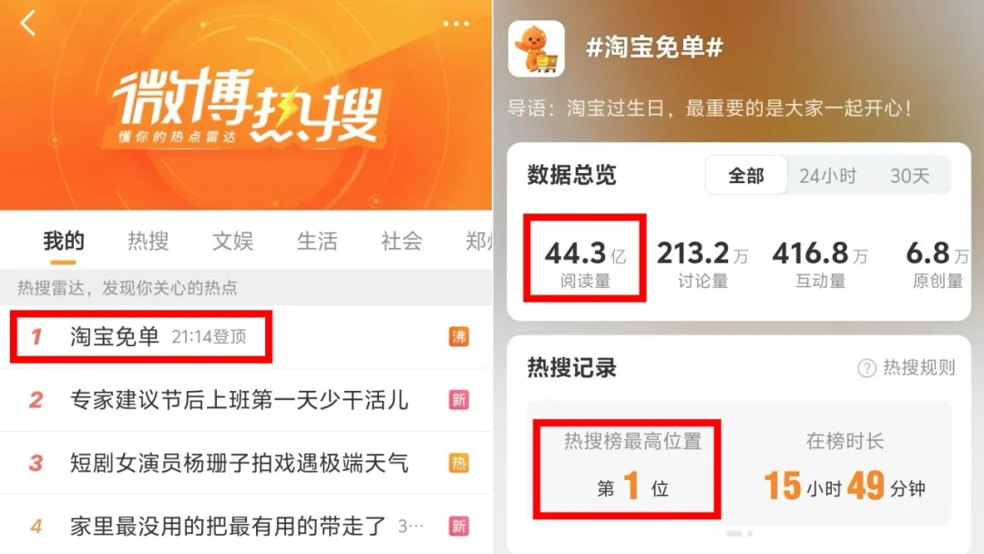 昨天上午,#淘寶免單#、#質子之爭#等話題迅速登上微博熱搜榜一,閲讀量44.6億,互動量和討論量超過600萬。