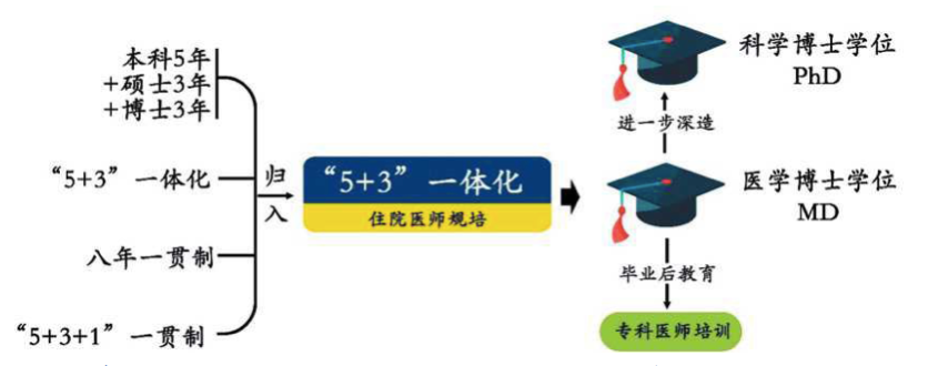 他建議,將目前培養醫學博士的四種路徑統一化為 “5+3” 一體化的模式(期間已經完成住院醫師規培),取得醫學博士學位後,就可以做全科醫生,如果下一步對科研感興趣,可以繼續深造拿科學博士學位(PhD),或者進行3到5年的專科醫師培訓,成為專科醫師。