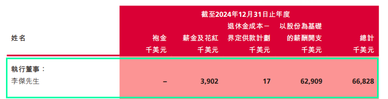 極兔速遞創始人李傑以66828千美元(約合4.81億元人民幣)年薪登頂,一人獨攬董事層總薪酬(67229千美元,約合4.84億人民幣)的99.4%。從結構看,這筆薪酬主要由薪金、花紅、退休金成本及股份收入構成,其中,股份收入佔比94%,薪金收入僅佔6%左右。