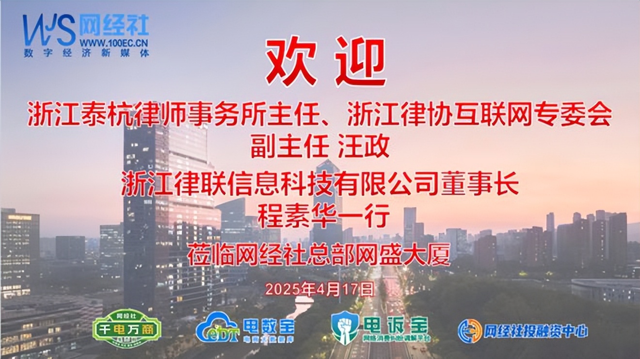4月17日,浙江泰杭律師事務所主任、浙江律協互聯網專委會副主任汪政,浙江律聯信息科技有限公司董事長程素華一行蒞臨網經社總部網盛大廈參訪交流,網經社創始人曹磊等進行接待。