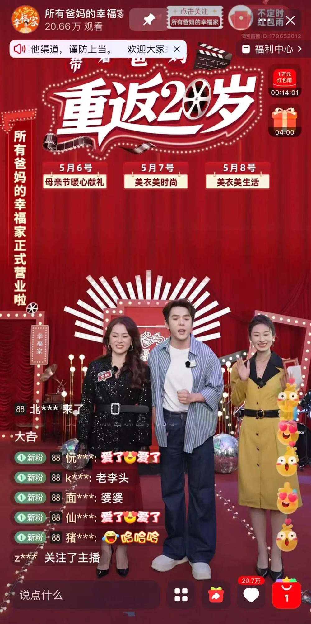 近日,他在直播間宣佈即將上線全新主題直播間——“所有爸媽的幸福家”,定於5月5日正式開播,首期主題為“重返20歲”,將邀請助播模特的父母及自己的母親一同亮相,主打中老年羣體的生活方式與消費場景。