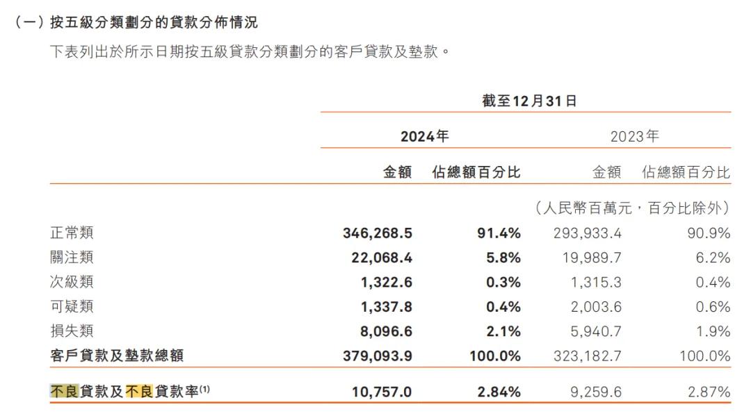 該行2024年末不良率2.84%,而全國城商行平均不良貸款率為 1.76%,同時該行還有高達5.8%的關注類貸款。