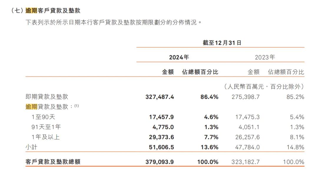 這還沒完,該行逾期貸款佔比高達13.6%,其中逾期90天以上貸款佔比9%。根據《商業銀行金融資產風險分類辦法》,本金、利息或收益逾期超過90天的金融資產至少歸為次級類。