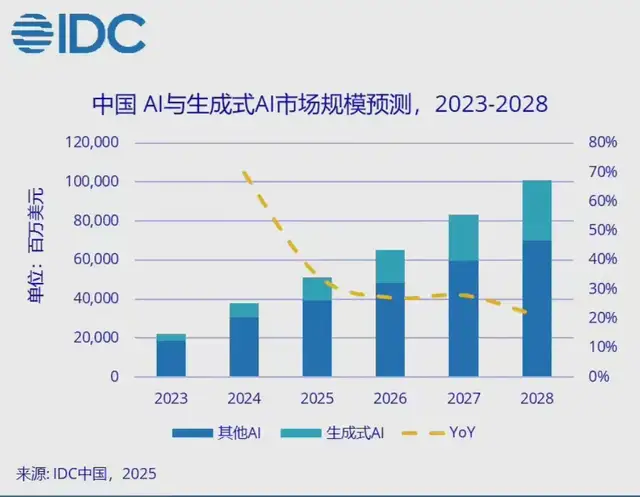 IDC數據顯示,預計到2028年全球AI市場將激增至8159億美元,五年複合增長率(CAGR)達32.9%。其中,生成式AI全球市場五年複合增長率或高達63.8%,到2028年市場規模將達到2842億美元,佔AI市場投資總規模的35%,中國市場的企業則更為突出。