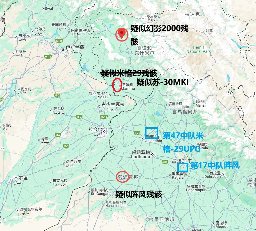 “陣風”戰鬥機被擊落的地點則在基地東北方20千米處,看起來是印度空軍使用“陣風”戰鬥機襲擊拉合爾、拉瓦爾品第周邊的目標,然後準備返航比夏納空軍基地時候,突然遭到了巴軍偷襲。至於第三架被擊落的米格-29或者蘇-30MKI戰鬥機,目前還不知道它究竟掉在哪了。