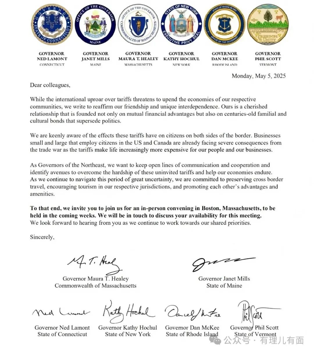 美國國內同樣在醖釀着反對浪潮,當地時間5月5日,美國東北部馬薩諸塞州、緬因州、紐約州、康涅狄格州、羅得島州、佛蒙特州這六個州的州長向加拿大六個省的省長髮出邀請,擬在波士頓舉行會談,討論“美國關税政策的影響,以及美國和加拿大如何繼續合作維持強勁的貿易關係”。這一舉措,無疑表明了各州要甩開特朗普政府單幹,再發展下去就是“美國東北獨立”。