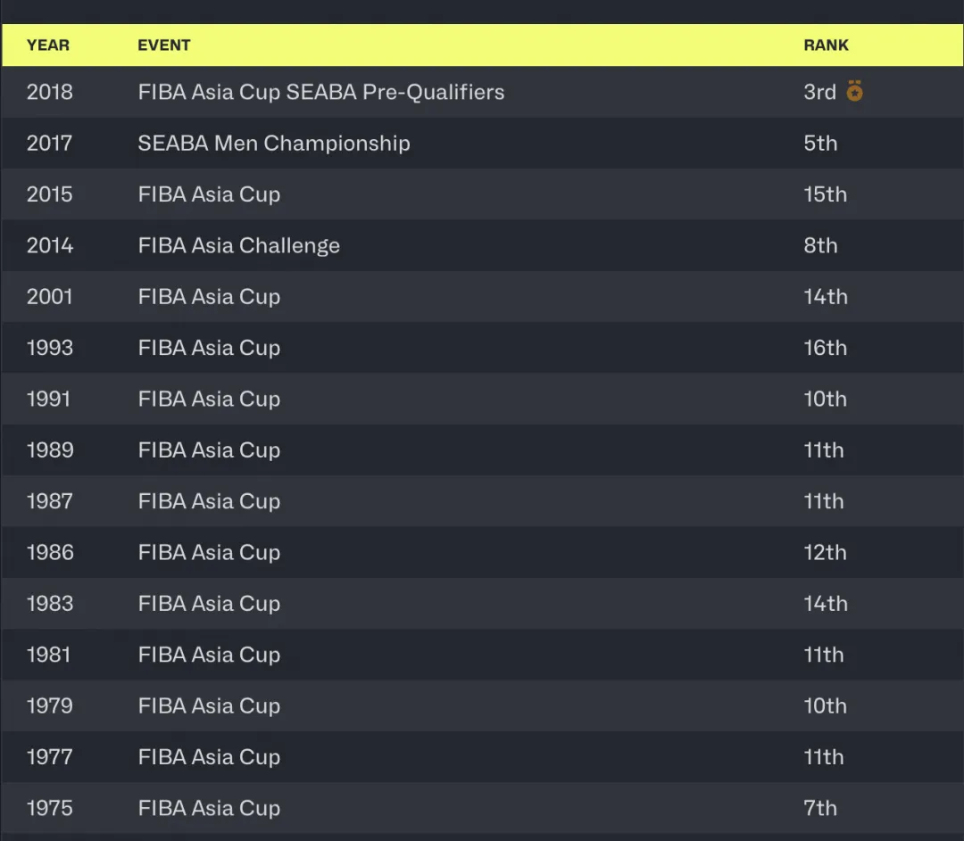 與此同時,新加坡男籃的戰績也急轉而下,1993年,新加坡參加亞錦賽,6場全敗,本以為這是低谷,但接下來的12年,他們連參加亞錦賽的資格都沒有。向外,國家隊表現平平,往內,半職業聯賽難產。