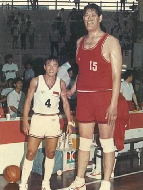這支八一隊有一位新加坡人的老熟人,穆鐵柱。1977年,中國男籃第一次去新加坡打友誼賽,穆鐵柱就是頭牌。八一抵達新加坡時,來了很多粉絲和穆鐵柱合影。這屆魚尾獅杯,穆鐵柱是最高的球員,2米28,最矮的是新加坡國手鐘有生,身高1米68,兩人特地合了張影。