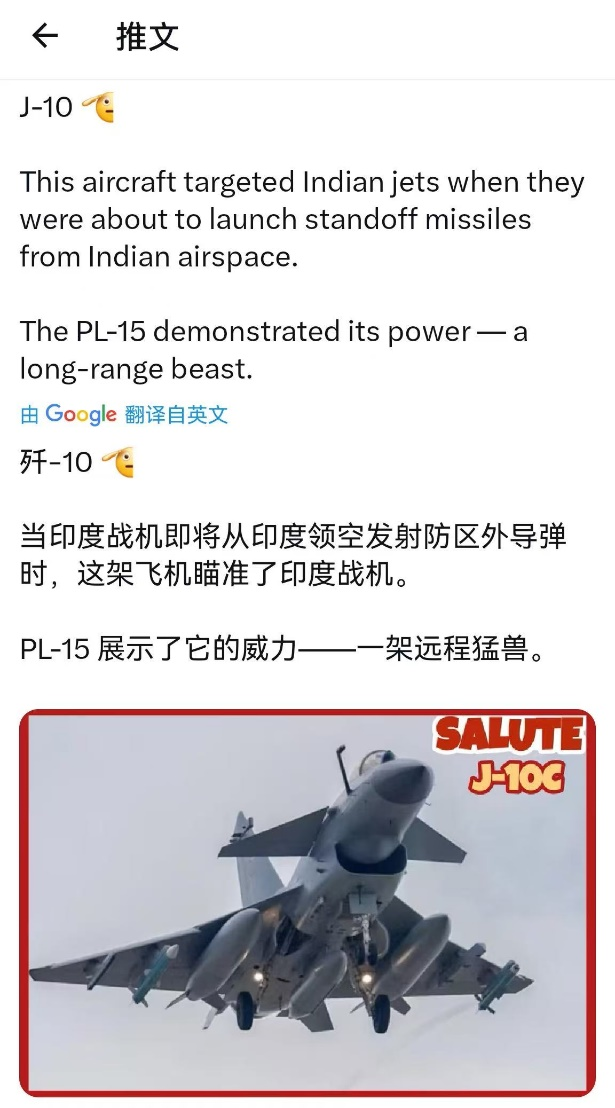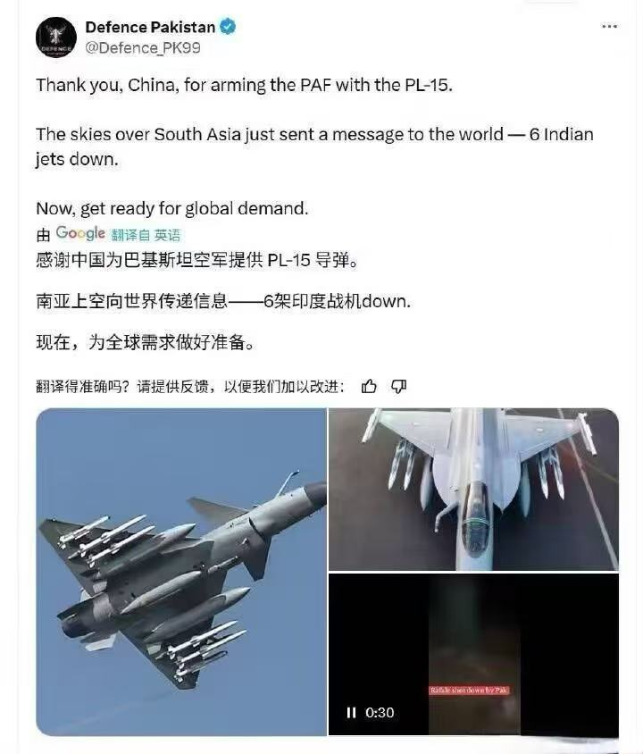 有爆料印度和巴基斯坦空軍鏖戰的全過程也正如棉花絮之前《印度和巴基斯坦關係爆發衝突只會帶來更多恐怖主義和死亡》闡述的一樣,印度空軍雖然數量佔據優勢,但不會佔到任何便宜。雖然有爆料稱當印度空軍的“陣風”與蘇-30MKI戰機編隊攜帶“斯卡普-EG”隱身巡航導彈進入距邊境80公里空域時,巴基斯坦部署的紅旗-9P防空系統率先發射遠程攔截彈,將一架“陣風”戰機凌空摧毀,但是根據剛剛出爐根據巴基斯坦的官方報道戰果全部來自殲10C戰鬥機及PL-15E空空導彈。