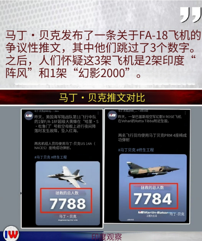 通過馬丁·貝克發佈了一條關於FA-18飛機的爭議性推文,其中他們跳過了3個數字。之後,人們懷疑這3架飛機是2架印度陣風”和1架“幻影2000”。而俄羅斯消息來源報道稱根據網絡上出現的畫面,可以得出結論,印度空軍在一夜之間至少損失了兩架幻影 2000 和一架達索陣風戰鬥機。而根據美國有線電視新聞網的報道,巴基斯坦這次擊落的戰鬥機中包括了3架法制“陣風”戰機、一架米格-29戰機和一架蘇-30戰機。
