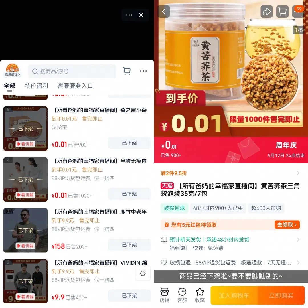 5月5日的首播,主要是打響名氣,直播間也以福利品為主。還原90年代場景的直播間中,福利品是標價統一為0.01元的幹發帽、恆源祥棉襪、黃苦蕎茶和紅參片等,0.1元的廚房紙和無糖黑芝麻丸,還有到手價9.9元的棉芭莎小黑褲、無袖馬甲和鹿竹中老年夏裝。