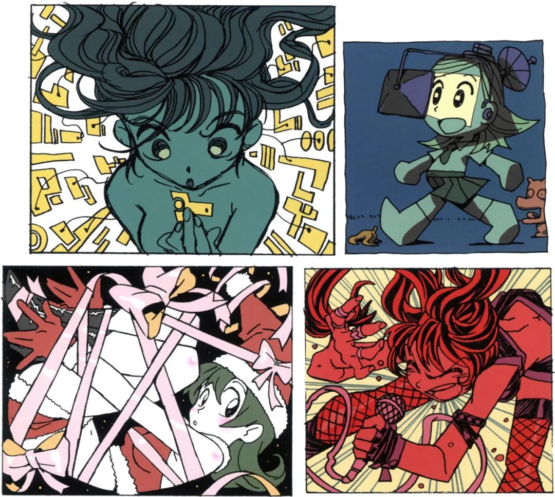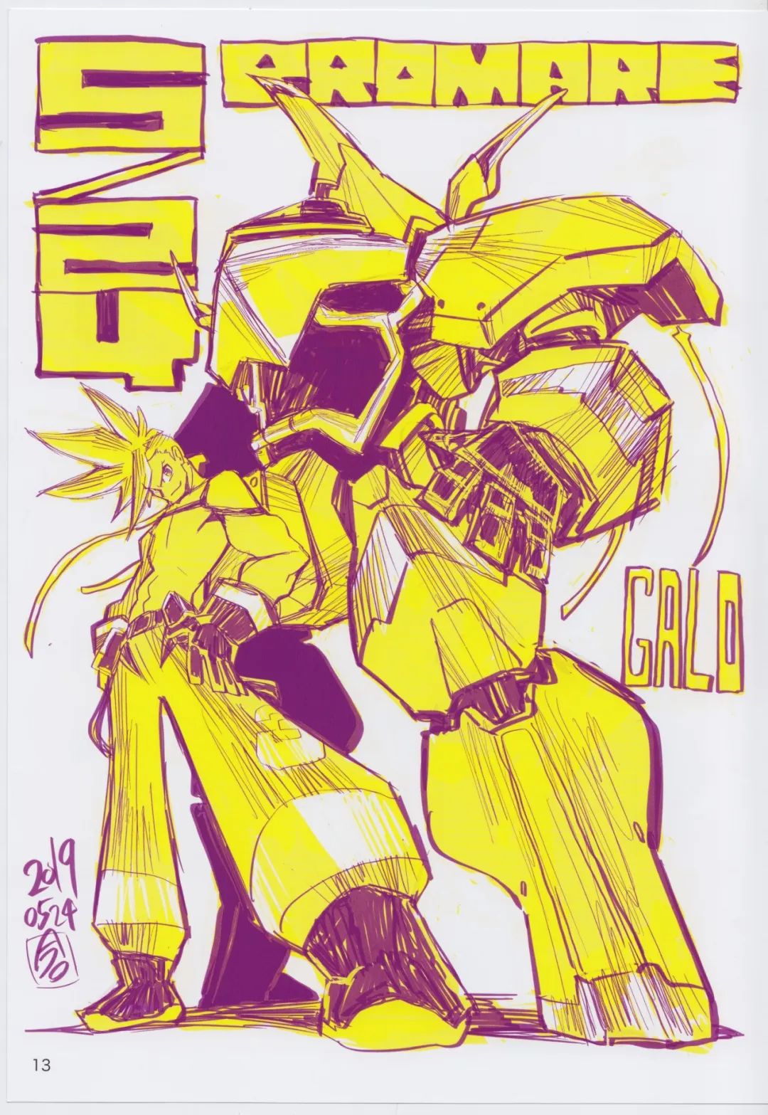 而且,他並不侷限於手繪。《雙斬少女》中他嘗試將數字技術和賽璐璐風格融合,《普羅米亞》中將手繪筆觸和光效加入3D場景,《宇宙巡警露露子》畫集中用數字繪畫模擬手繪線條。