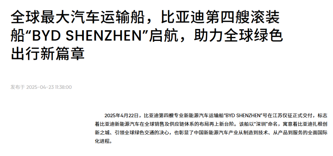 第三,比亞迪組建了一支專門的遠洋艦隊,已投入4艘滾裝運輸船。一艘船一次就能運輸9200輛車,4艘一個來回,就能運輸3.68萬輛了。而這樣的運輸船,比亞迪一共訂購了8艘,隨着運輸船的交付,運力還將持續增加。其中,“深圳”號是全球最大的汽車運輸船,也彰顯着比亞迪開拓海外市場的蓬勃野心。