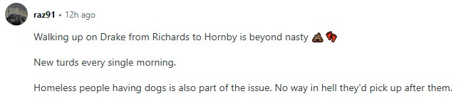 “Drake街的一段路(從Richards至Hornby)簡直令人作嘔。每天早上都有新的糞便。無家可歸者養狗也是問題的一部分。他們根本不會為狗清理糞便。”